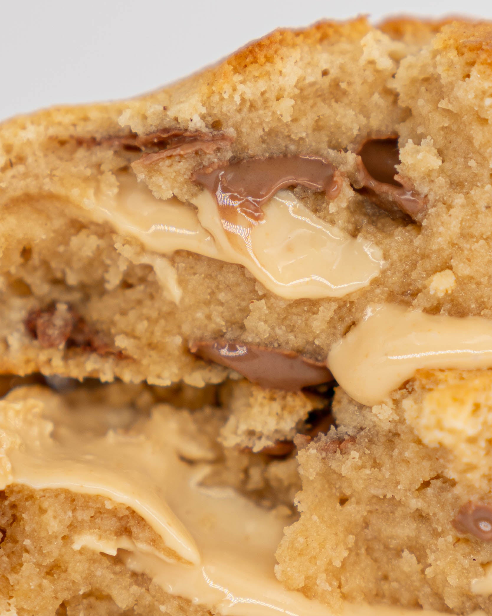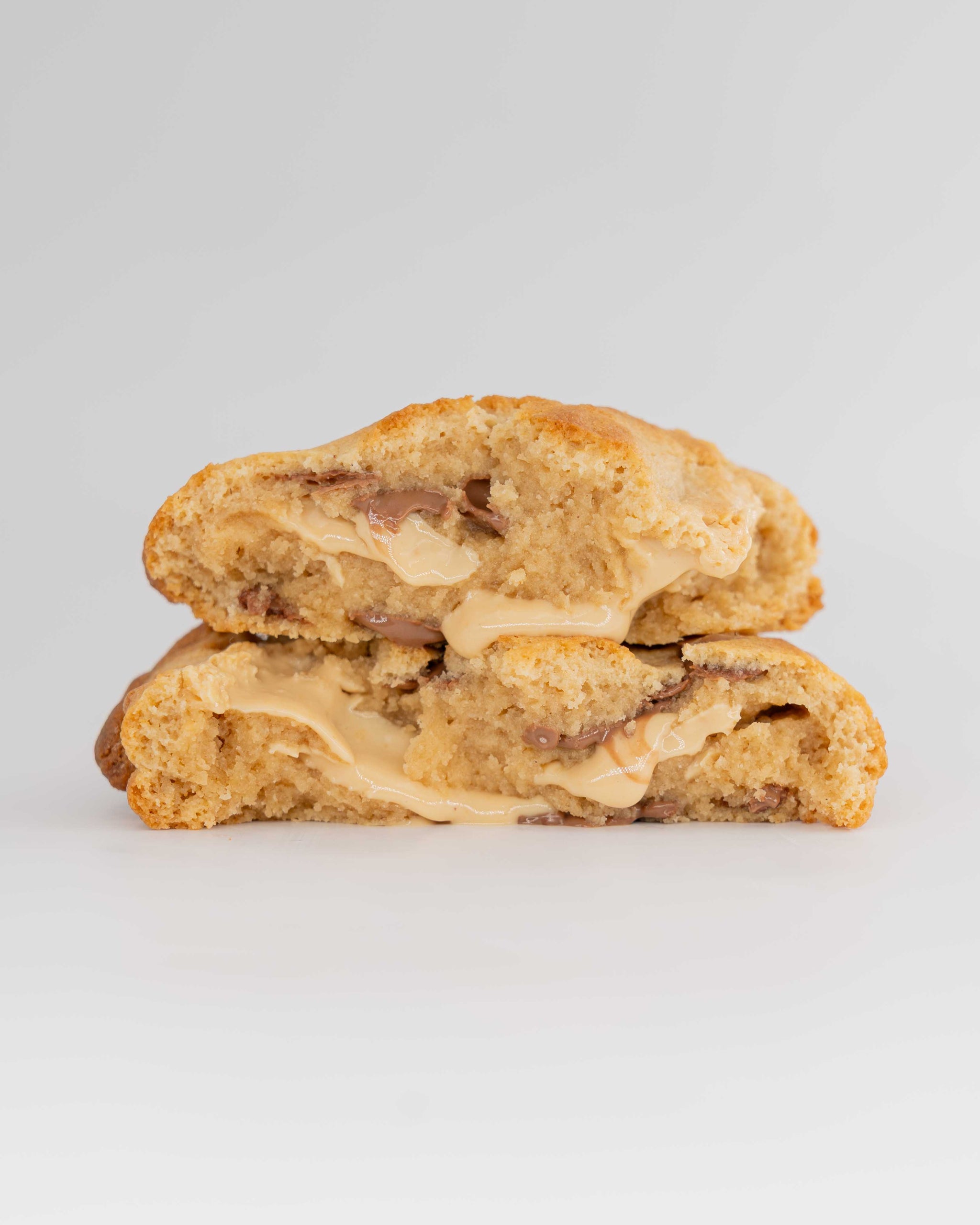 Exterior firme y crujiente, interior jugoso y fundente. Elaborada sin gluten, con chocolate de cacahuete artesanal y trozos generosos de chocolate con leche belga que aportan intensidad y carácter en cada bocado.